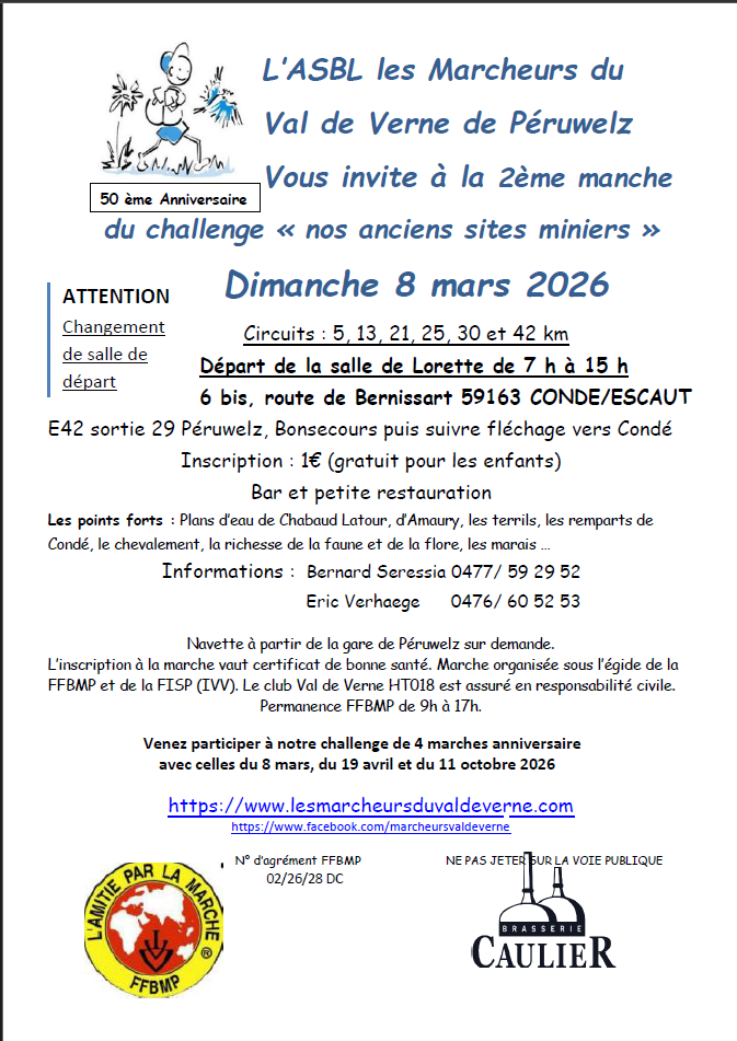 Notre prochaine marche fédérale "A travers nos anciens sites miniers", planifiée le Dimanche 08 Mars 2026, prendra son départ depuis la salle de Lorette, 6 bis route de Bernissart à Condé sur l'Escaut au lieu de la salle Léo Lagrange – rue Pasteur à Hergnies en France.